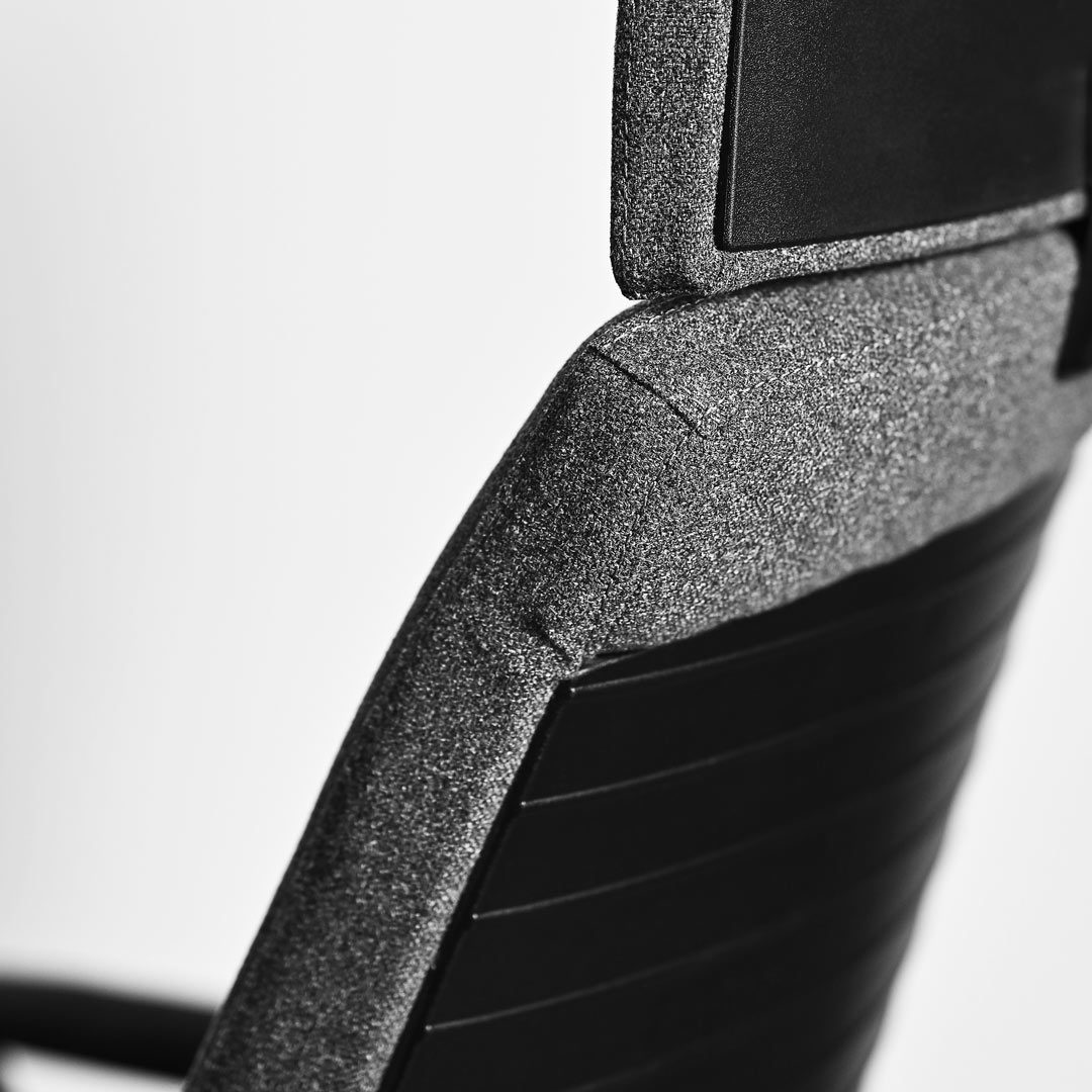 Sedište ove kancelarijske stolice izrađeno je iz dva dela, u osnovi od parene bukve debljine 12mm i spolja od prvoklasnog polipropilena izlivenog sistemom ubrizgavanja. Izuzetno udoban sedeći deo stolice krije se u činjenini da se koristi sunđer gustine 32 DNS debljine 60mm. Premium štof kojim je tapacirana omogućava prijatno sedenje i tokom dužeg perioda. Naslon stolice izrađen je takođe od polipropilena, sa efektnom oblogom u u crnoj boji koja stolici daje posebnu dozu luksuza. Rukonasloni su fiksni i veoma čvrsti, šrafljeni podjednako i za sedeći deo stolice i za sam naslon. Na gornjoj strani su tapacirani istim štofom, što garantuje mekani oslonac za ruke i prijatan rad.